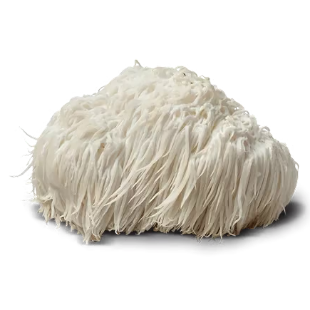 The brain-loving mushroom Lion's Mane has its shaggy, lion-like appearance. It supports cognitive function, focus, memory, and nerve health, thanks to compounds that promote nerve growth and mental clarity.
