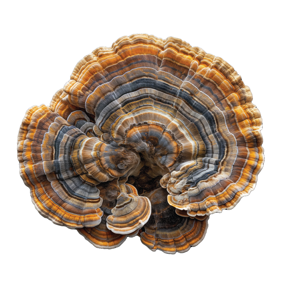 Turkey Tail - Enhances gut health and immune support through prebiotics and polysaccharides.